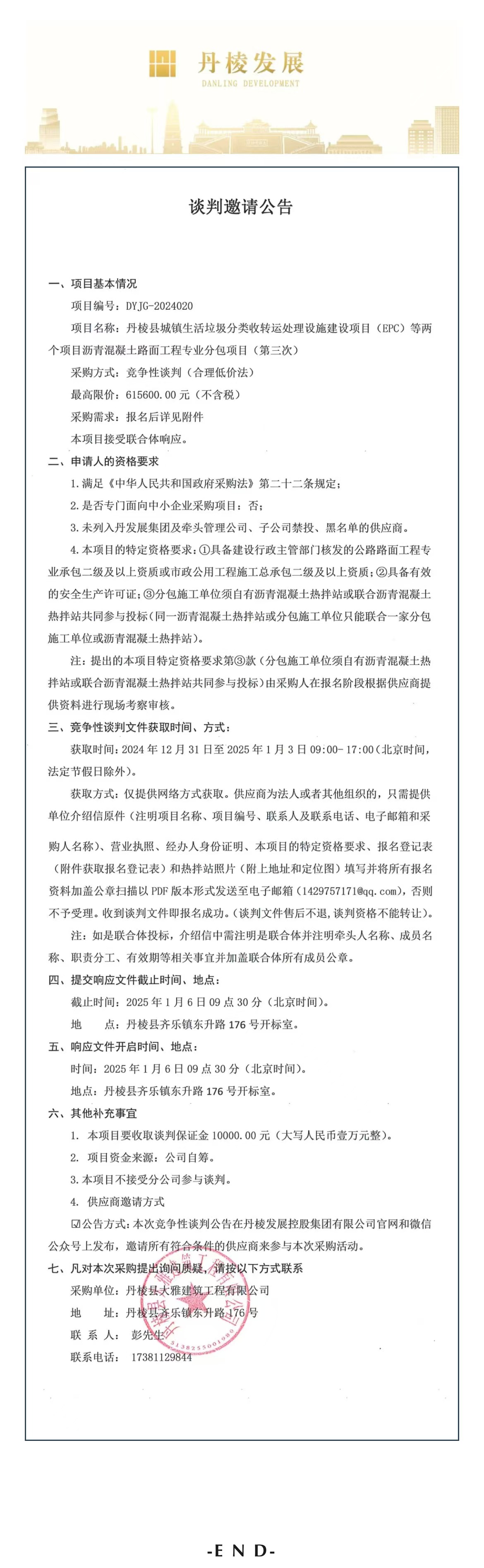 丹棱縣城鎮(zhèn)生活垃圾分類收轉運處理設施建設項目(EPC)等兩個項目瀝青混凝土路面工程專業(yè)分包項目(第三次)談判邀請公告