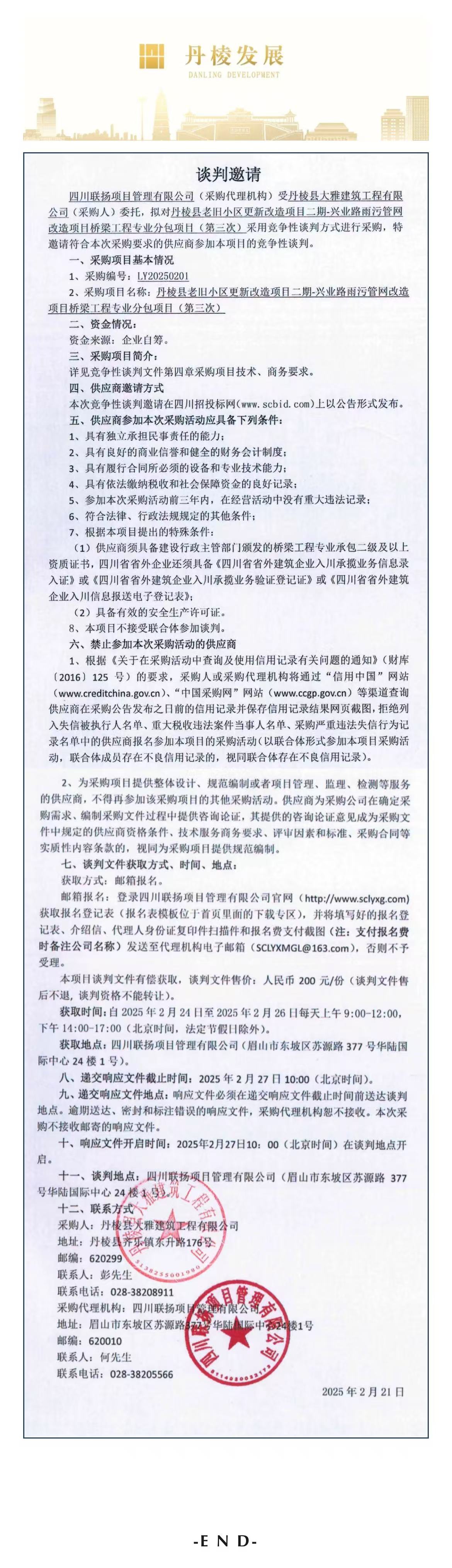 丹棱縣老舊小區(qū)更新改造項(xiàng)目二期-興業(yè)路雨污管網(wǎng)改造項(xiàng)目橋梁工程專業(yè)分包項(xiàng)目談判邀請(qǐng)公告(第三次)