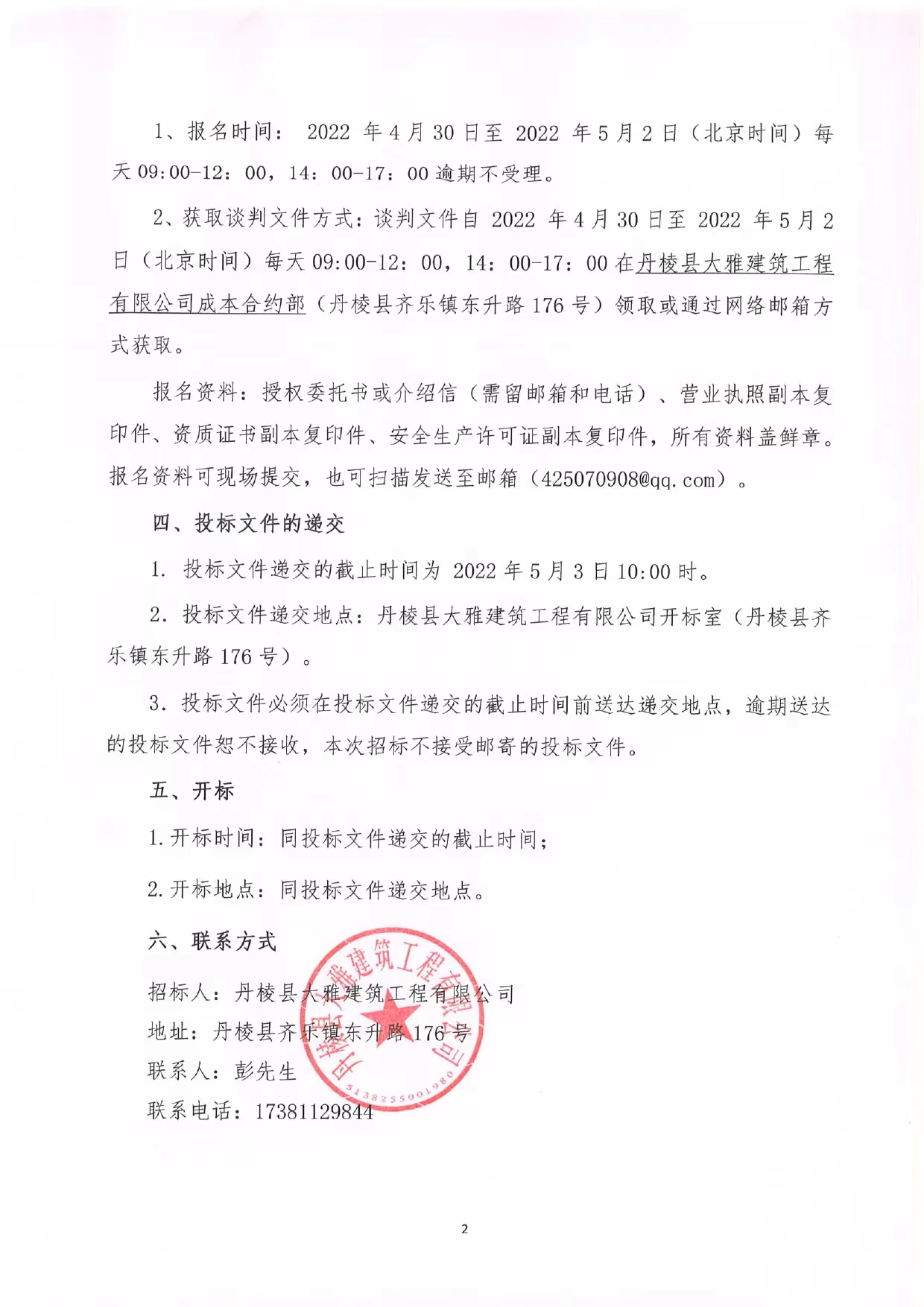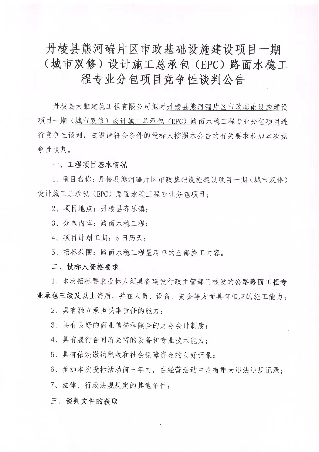 丹棱縣熊河碥片區(qū)市政基礎(chǔ)設(shè)施建設(shè)項(xiàng)目一期(城市雙修)設(shè)計(jì)施工總承包(EPC)路面水穩(wěn)工 程專業(yè)分包項(xiàng)目競爭性談判公告