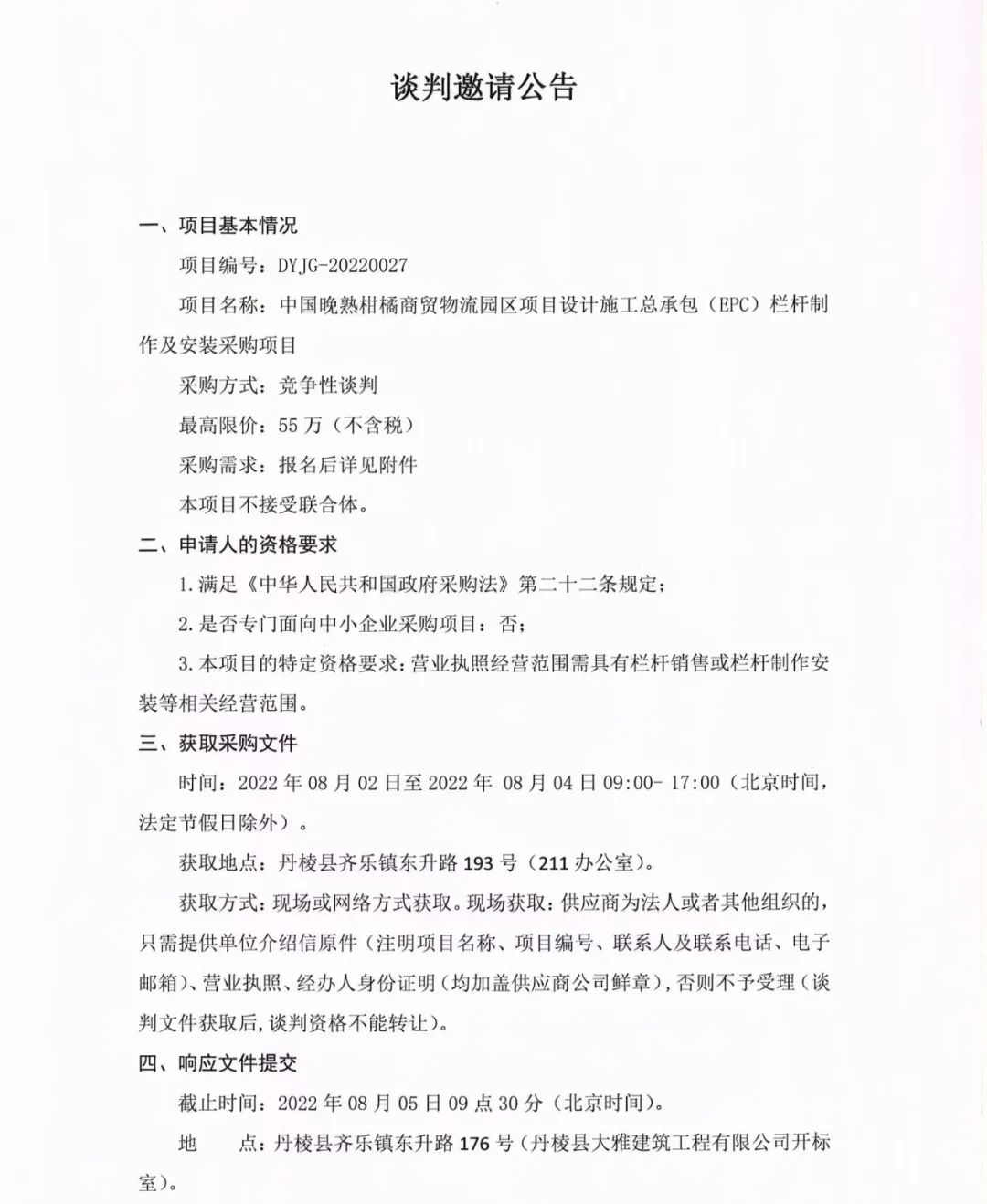 中國(guó)晚熟柑橘商貿(mào)物流園區(qū)項(xiàng)目設(shè)計(jì)施工總承包(EPC)欄桿制作及安裝采購(gòu)項(xiàng)目談判邀請(qǐng)公告