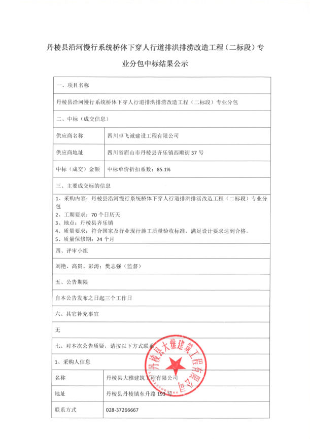 【大雅建筑公司】丹棱縣沿河慢行系統(tǒng)橋體下穿人行道排洪排澇改造工程(二標(biāo)段)專(zhuān)業(yè)分包中標(biāo)結(jié)果公示