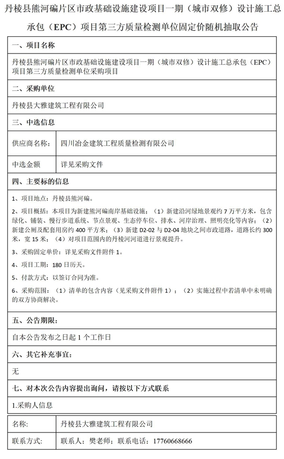 丹棱縣熊河碥片區(qū)市政基礎設施建設項目一期(城市雙修)設計施工總承包(EPC)項目第三方質(zhì)量檢測單位固定價隨機抽取公告