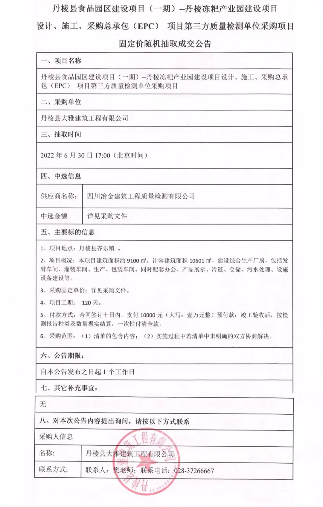丹棱凍粑產(chǎn)業(yè)園建設(shè)項(xiàng)目設(shè)計(jì)、施工、采購總承包(EPC)項(xiàng)目第三方質(zhì)量檢測單位采購項(xiàng)目固定價(jià)隨機(jī)抽取成交公告