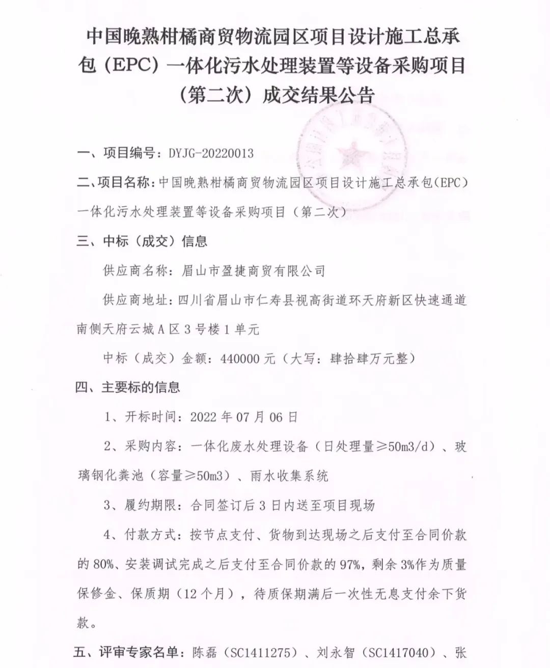 中國晚熟柑橘商貿(mào)物流園區(qū)項(xiàng)目設(shè)計(jì)施工總承包(EPC)一體化污水處理裝置等設(shè)備采購項(xiàng)目(第二次)成交結(jié)果公告