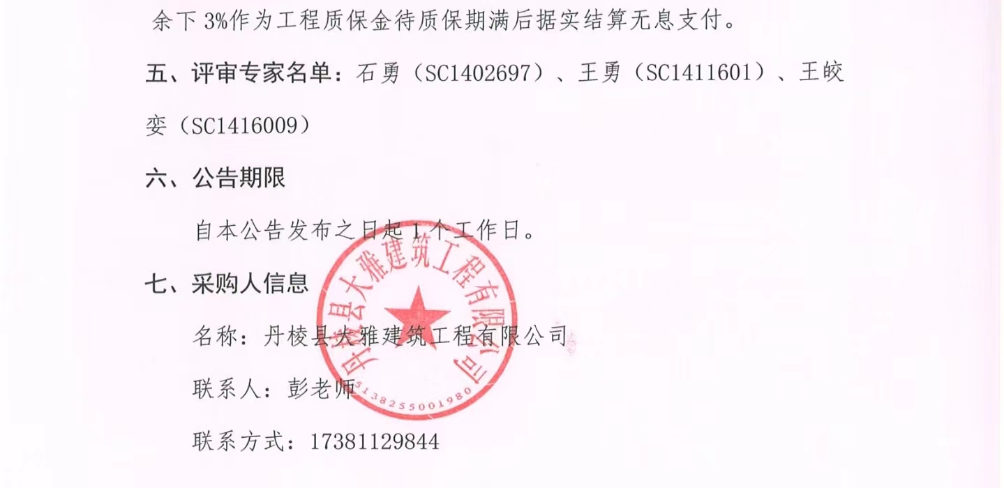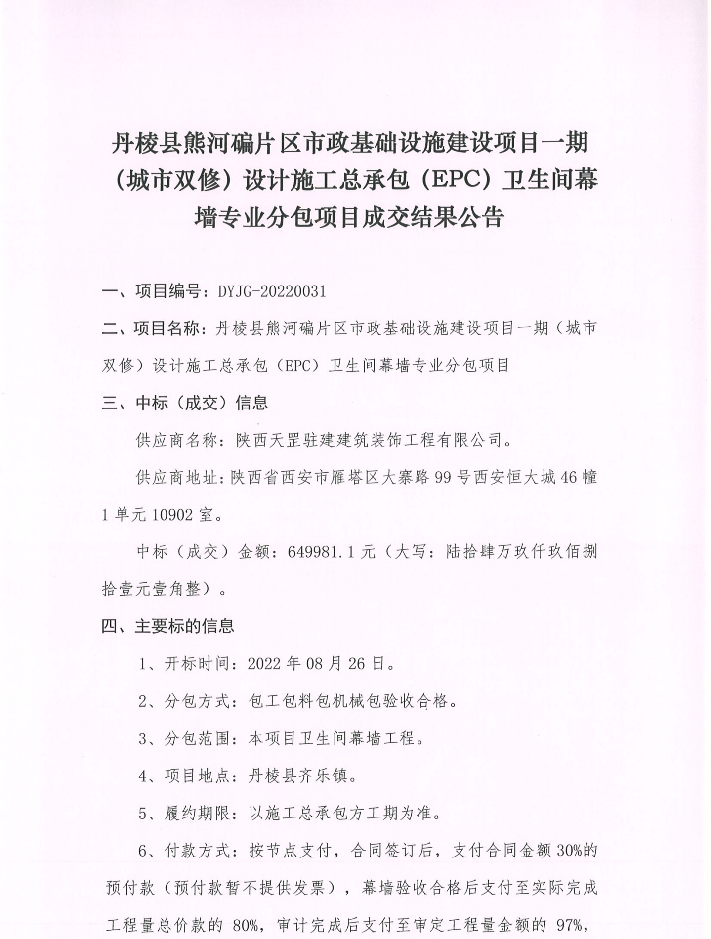 丹棱縣熊河碥片區(qū)市政基礎設施建設項目一期(城市雙修)設計施工總承包(EPC)衛(wèi)生間幕墻專業(yè)分包項目成交結果公告