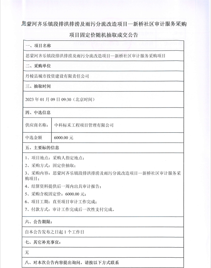 思蒙河齊樂(lè)鎮(zhèn)段排洪排澇及雨污分流改造項(xiàng)目--新橋社區(qū)審計(jì)服務(wù)采購(gòu)項(xiàng)目固定價(jià)隨機(jī)抽取成交公告