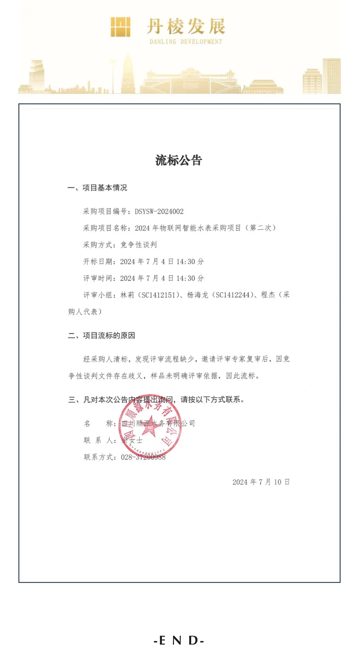2024年物聯(lián)網(wǎng)智能水表采購項(xiàng)目(第二次)流標(biāo)公告
