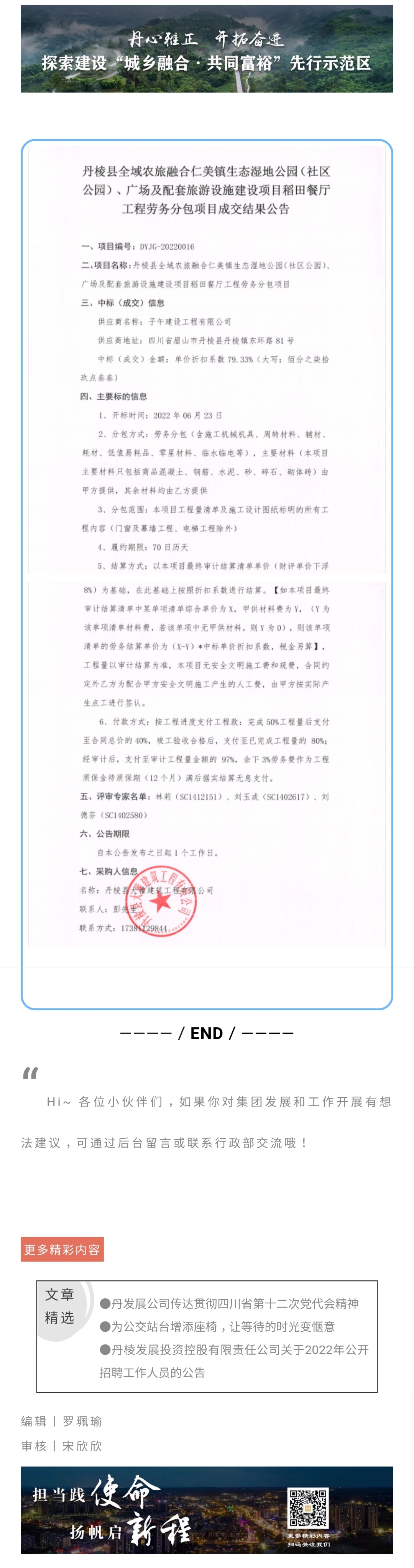 丹棱縣全域農旅融合仁美鎮(zhèn)生態(tài)濕地公園(社區(qū)公園)、廣場及配套旅游設施建設項目稻田餐廳工程勞務分包項目成交結果公告