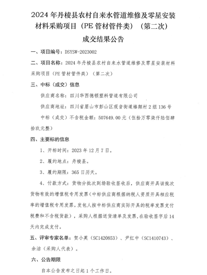 2024年丹棱縣農(nóng)村自來(lái)水管道維修及零星安裝材料采購(gòu)項(xiàng)目(PE管材管件類(lèi))(第二次)成交結(jié)果公告