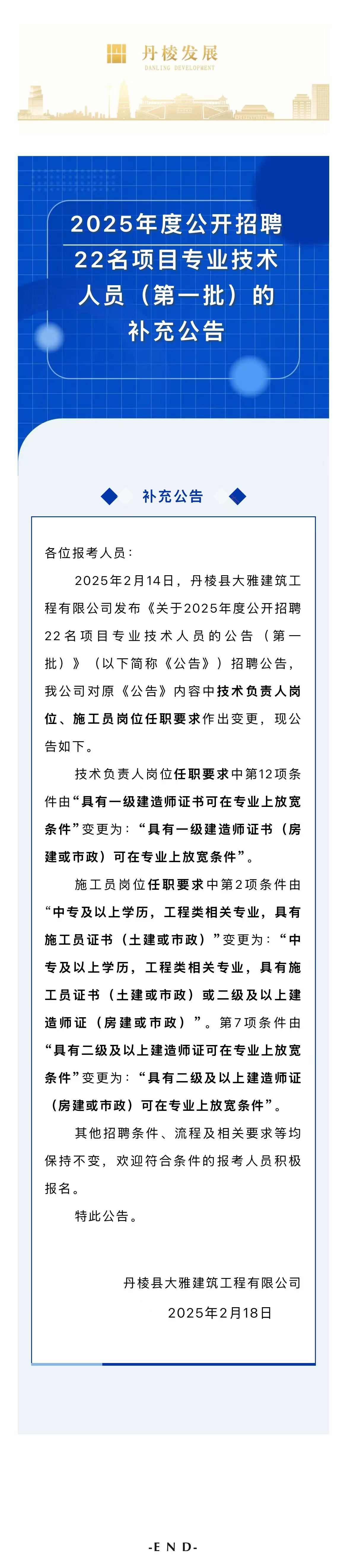 丹棱縣大雅建筑工程有限公司關(guān)于2025年度公開招聘22名項(xiàng)目專業(yè)技術(shù)人員(第一批)的補(bǔ)充公告