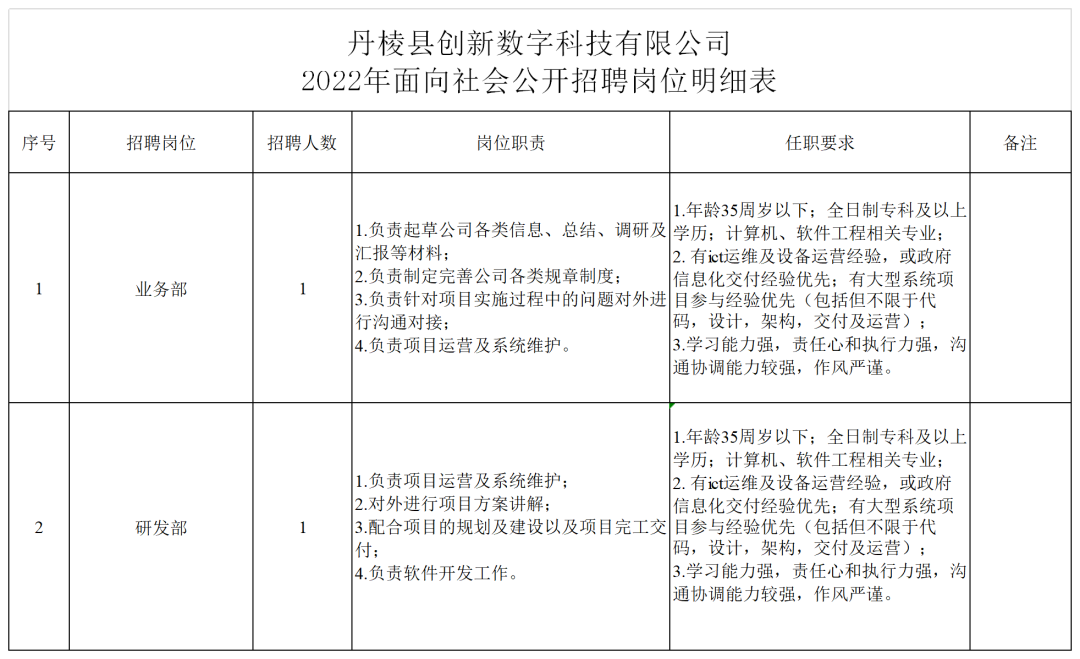 招聘崗位的學(xué)歷、專業(yè)、資歷、年齡等資格條件詳見附件《丹棱縣創(chuàng)新數(shù)字科技有限公司2022年面向社會公開招聘崗位明細表》。