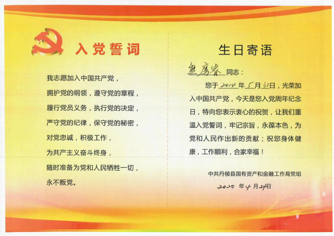工作安排后,縣國資金融局黨組集體為5月入黨黨員過政治生日,縣國資金融局(縣金融服務(wù)中心)副主任茍永慶同志過生日的黨員們送上精心制作的“黨員政治生日卡”,勉勵黨員同志要“常思入黨初衷、銘記入黨誓詞、牢記黨員義務(wù)”,發(fā)揮黨員先鋒模范作用,在今后的工作中不斷創(chuàng)先爭優(yōu),做好表率;顒幼詈螅w黨員同志在縣國資金融局黨組成員、副局長潘國榮同志的帶領(lǐng)下重溫入黨誓詞、面對黨旗莊嚴宣誓。